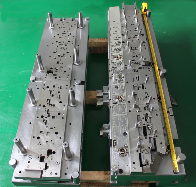 連續模,指的是壓力機在一次沖壓行程中,采用帶狀沖壓原材料,在一副模具上用幾個不同的工位同時完成多道沖壓工序的冷沖壓沖模,模具每沖壓完成一次,料帶定距移動一次,至產品完成。